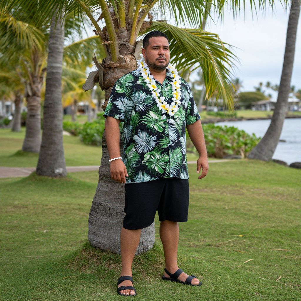 Photograph of a muscular, tan-skinned man with short black hair, wearing a black Hawaiian shirt with green palm leaves, black shorts, flip-f