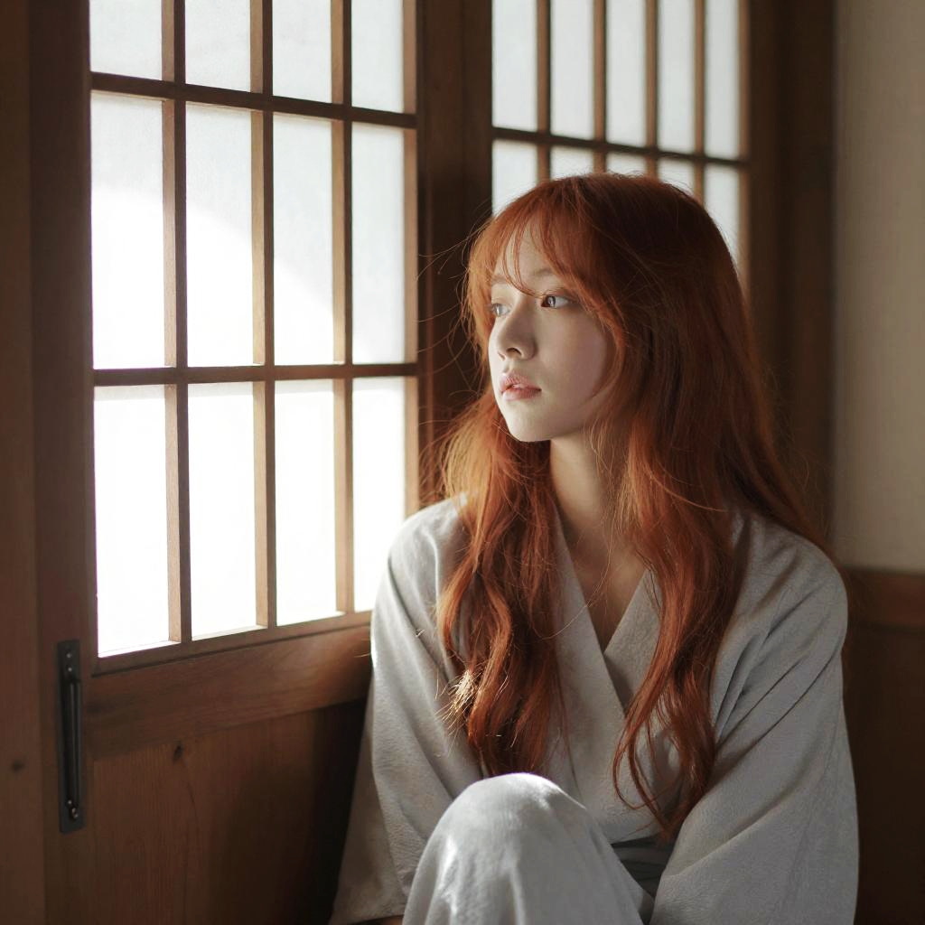 Asian girl with red hair sitting by a traditional wooden window, sunlight streaming through rice paper screens, soft pastel tones creating a calm and intimate atmosphere, gentle breeze moving strands of hair, subtle brushstroke texture blending traditional and modern aesthetics