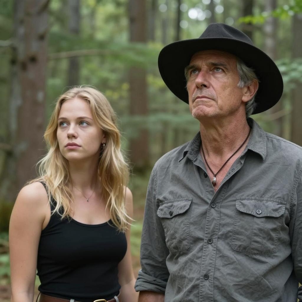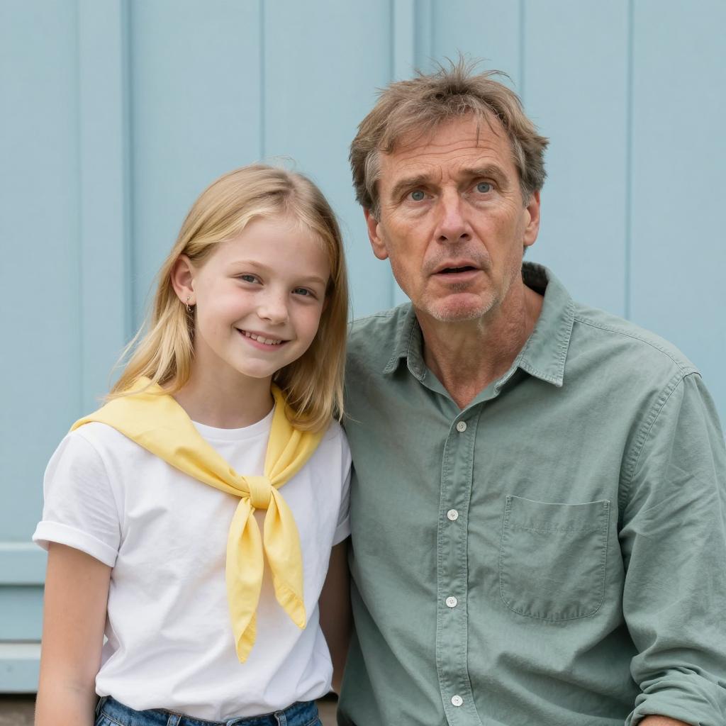 A middle-aged man and a young girl. The man with light brown hair, wearing a green button-up shirt, looks to the right with a surprised expression. The girl with blonde hair, wearing a white shirt and yellow scarf, smiles while leaning against him. They are in front of a light blue wooden wall.