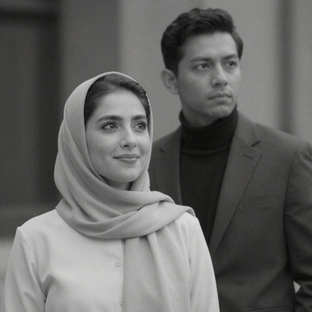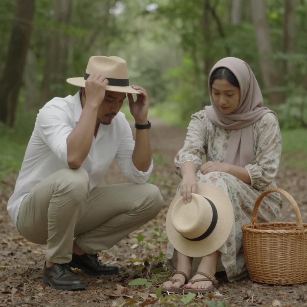 Photograph of a man and woman sitting on a forest path. Man in white shirt and beige pants, crouching, hands on hat. Woman in floral dress and headscarf, sitting, holding hat. Wicker basket with hat beside her. Sunlight filtering through trees. Man looks at woman, woman looks down. Greenery in background. Intimate, relaxed atmosphere. Both with focused expressions.