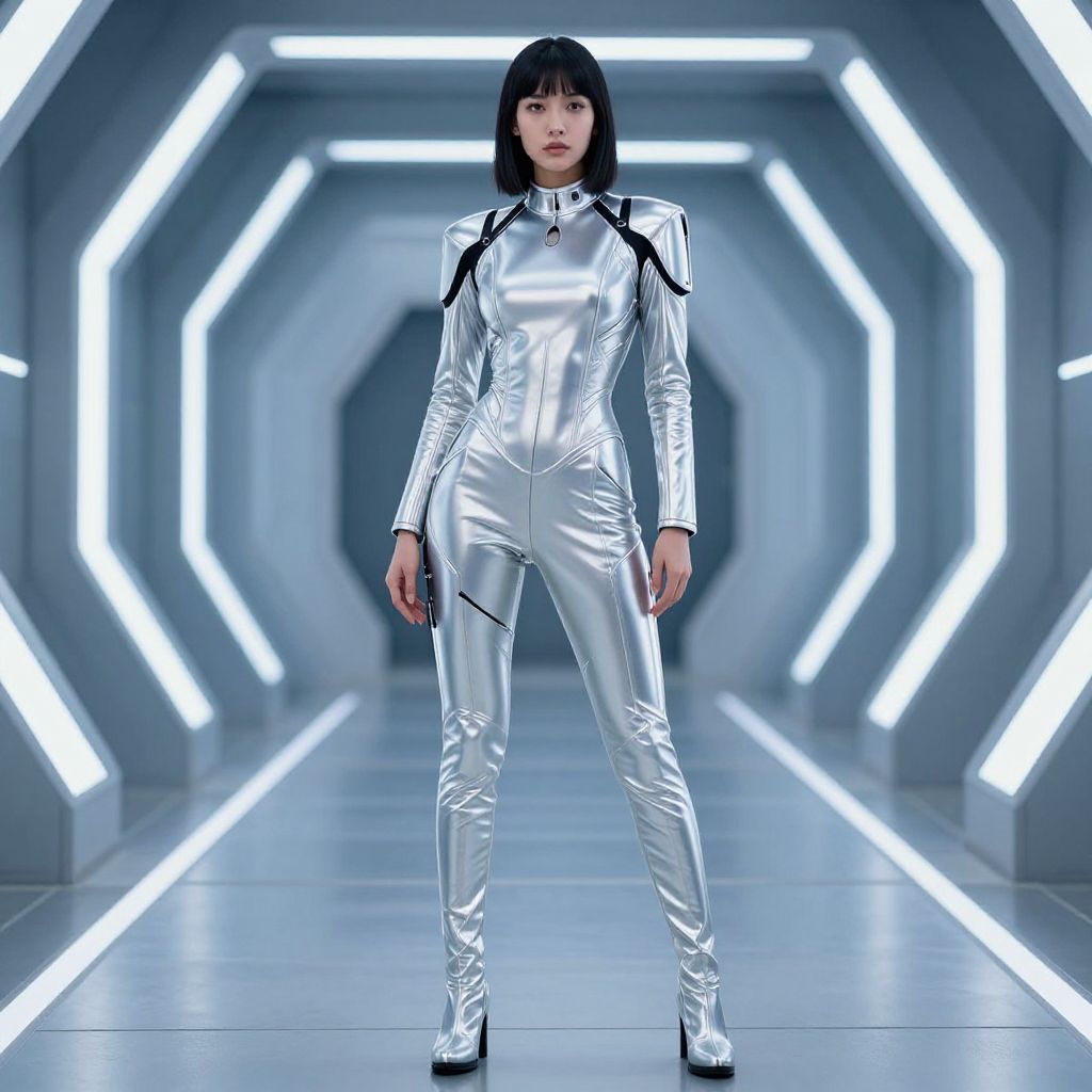 Photograph of an East Asian woman with straight black hair and bangs, standing in a futuristic, illuminated corridor. She wears a shiny, silver, long-sleeved jumpsuit with black straps, and matching silver high-heeled boots. The corridor has hexagonal walls with bright white LED lights, creating a sci-fi atmosphere. The woman stands confidently with her hands by her sides, facing the camera. The overall color palette is cool, with dominant shades of silver, white, and blue. The lighting highlights the metallic texture of her outfit.