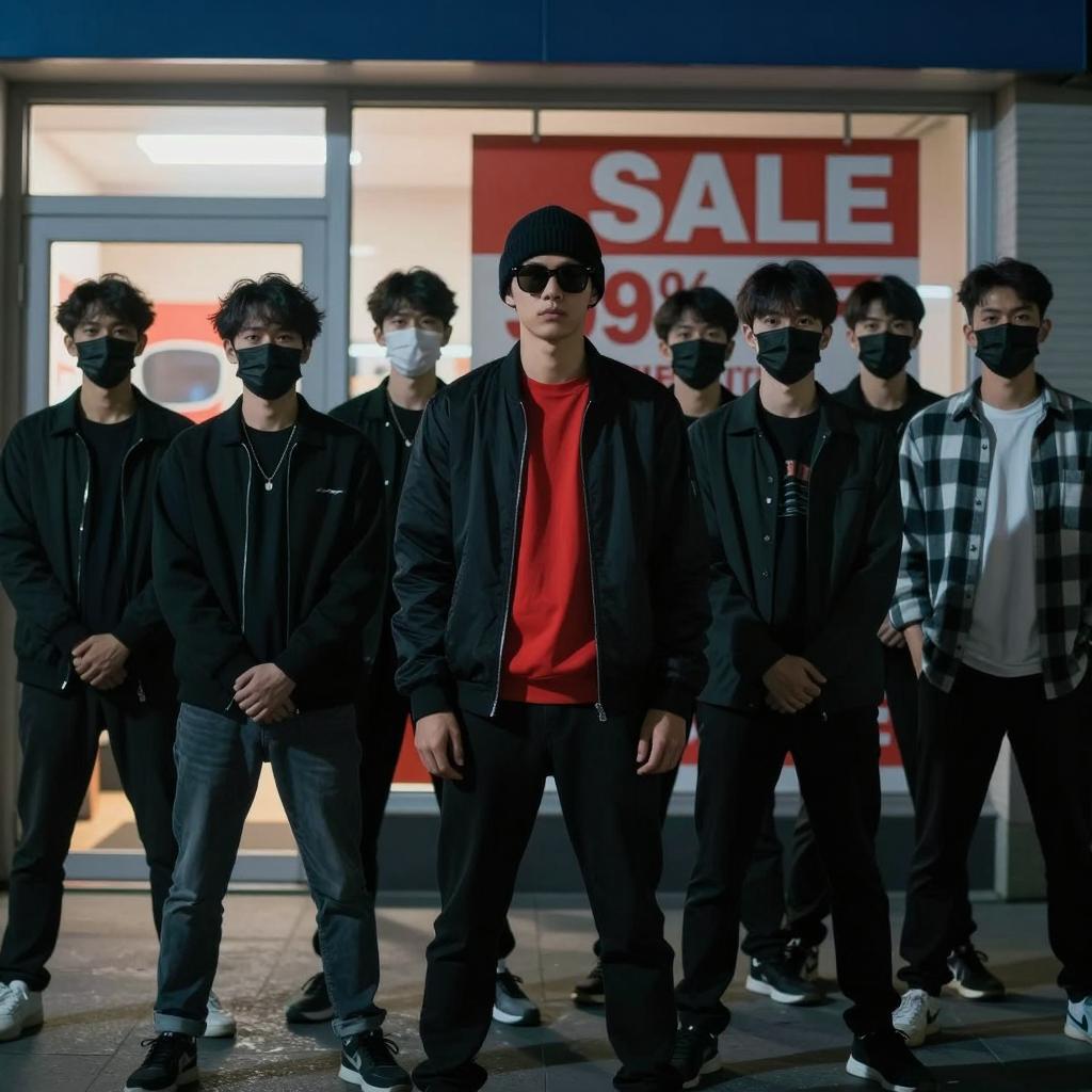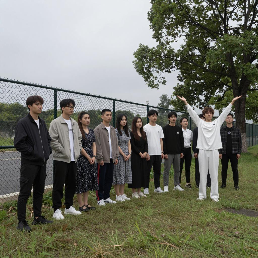 Group of eight people standing on a white platform with rocky terrain. Central figure in yellow jacket, hands in pockets, facing right. Others in casual clothing, standing in various poses. White chair with bag to left. Black background.