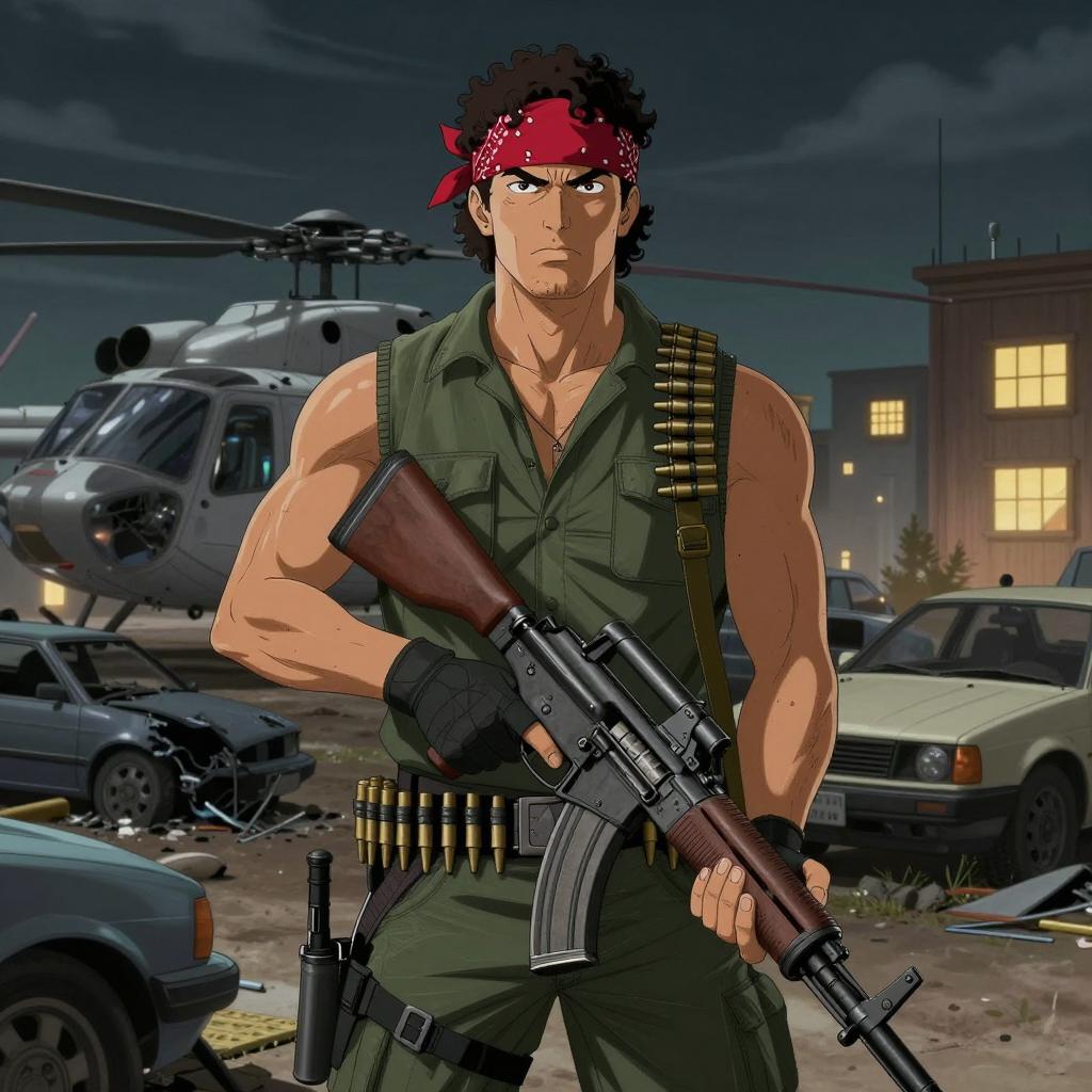 Illustration of a muscular man with dark curly hair, wearing a red bandana and green sleeveless shirt with bullet belts, holding a large rifle. Background includes a helicopter, crashed cars, and illuminated buildings. Night sky with clouds. Man's intense expression. Multiple vehicles in the background.
