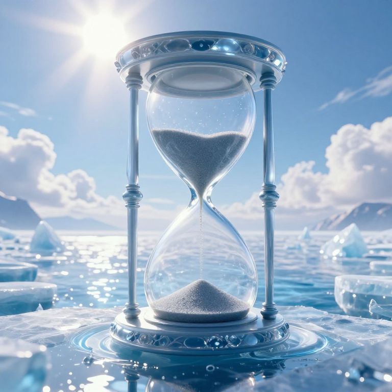 This photograph depicts an hourglass with a clear glass body and metallic pillars, standing on a reflective, icy surface. The hourglass contains a small amount of white sand at the top, gradually trickling down to a mound at the bottom. The background features a bright, sunlit sky with fluffy white clouds and a shimmering blue ocean. The image has a high-contrast, glossy style, with strong blue and white hues, creating a cold, ethereal atmosphere. The sun's reflection on the water and the ice adds a sparkling effect. The hourglass is centrally positioned, with its base slightly tilted.