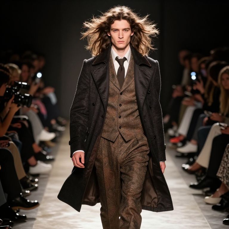 Photograph of a male model on a runway, wearing a dark brown three-piece suit with a white shirt and black tie, paired with a long, black, slightly shiny overcoat. He has long, wavy brown hair that flows as he walks. The background is dark, with blurred audience members seated on both sides, some taking photos. The runway is brightly lit, highlighting the model's intense gaze and the texture of his suit. The overall style is elegant and slightly edgy.
