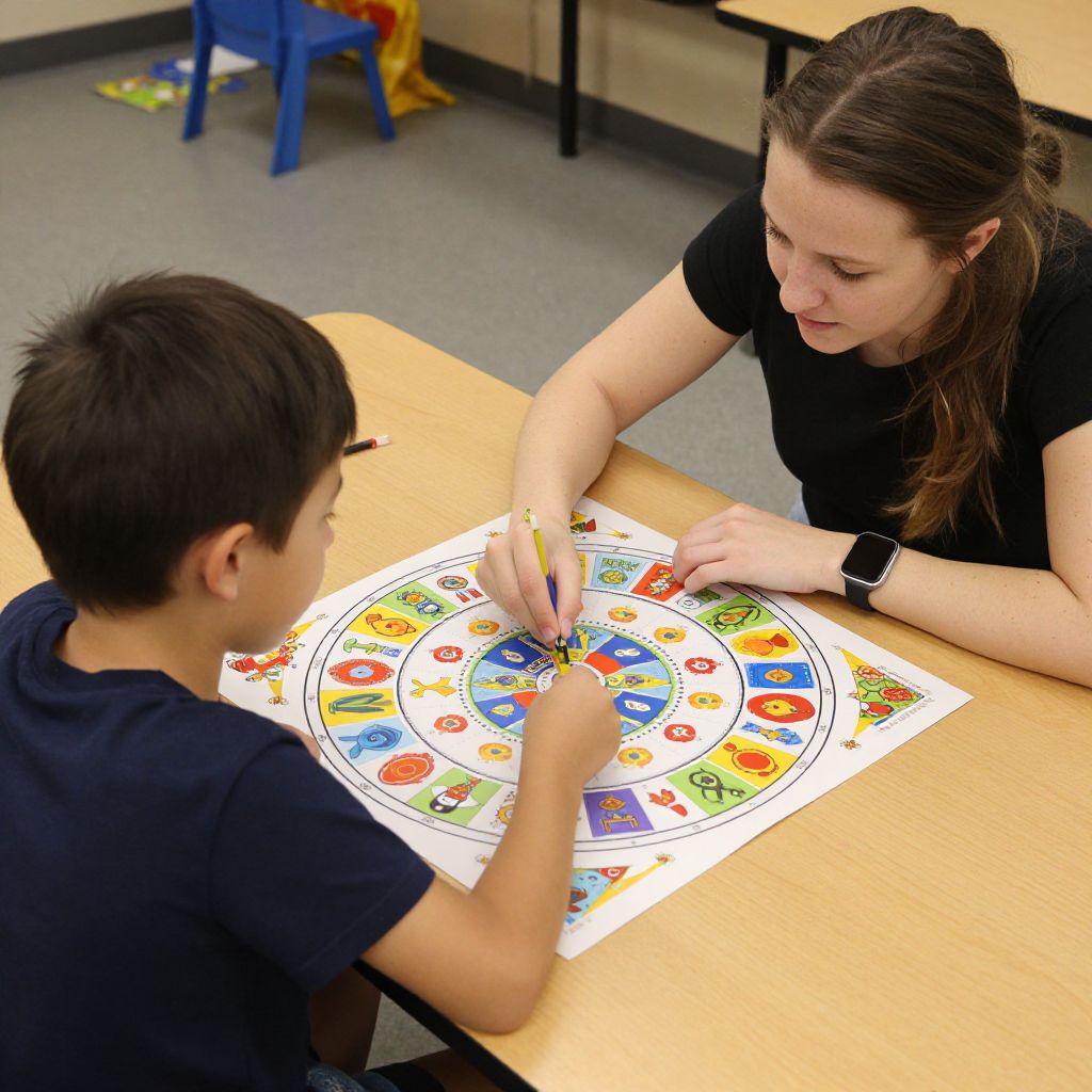 Two individuals, a young child and an adult woman, engage in a playful learning activity at a wooden table, focusing on a colorful circular educational game featuring vibrant patterns and designs, captured at the Eau Claire Children's Museum by Kelsey Smith.