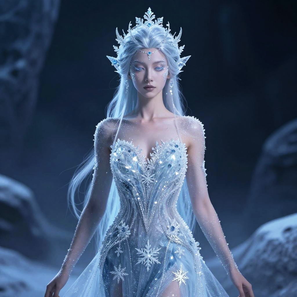 Exotic ice elemental maiden, extra large cleavage, slender build, crystalline skin, snowflake patterned gown.