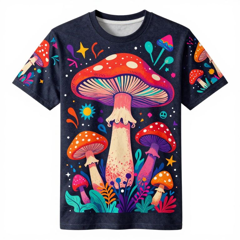 A vibrant, psychedelic t-shirt features an intricate, flat illustration of colorful mushrooms and abstract shapes against a dark background.