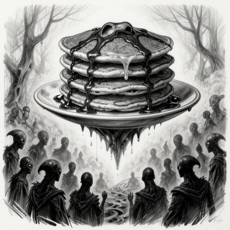 Unnerving full art sketch, fantasy, a stack of pancakes made out of alien darkness floating above a crowd of cultists in the style of HR Giger,