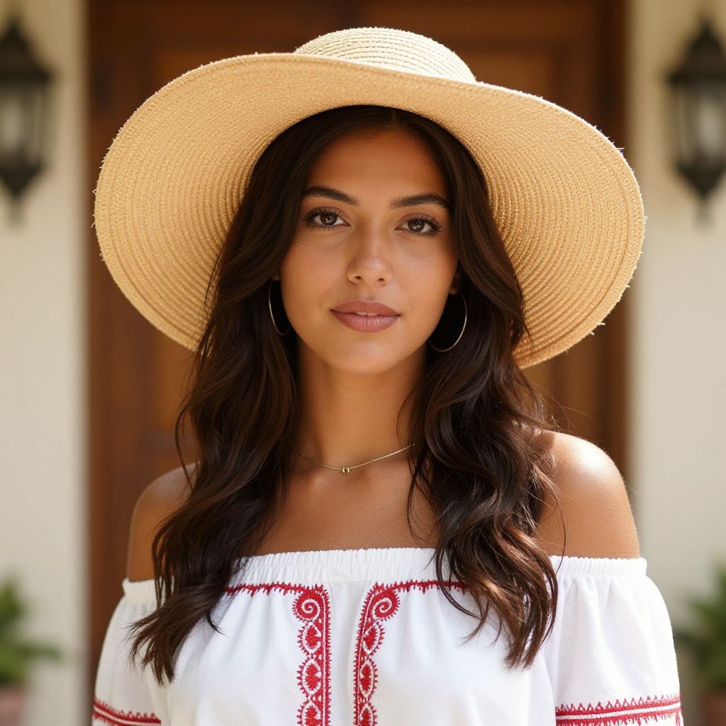 Photograph of a young woman with long, wavy dark brown hair and tan skin, wearing a large, straw sunhat and an off-the-shoulder white blouse with red embroidery. She has brown eyes, full lips with natural pink lipstick, and is wearing hoop earrings and a delicate necklace. The background features a blurred wooden door and wall-mounted lanterns, suggesting an outdoor setting. The lighting is bright, highlighting her serene expression and stylish casual attire.