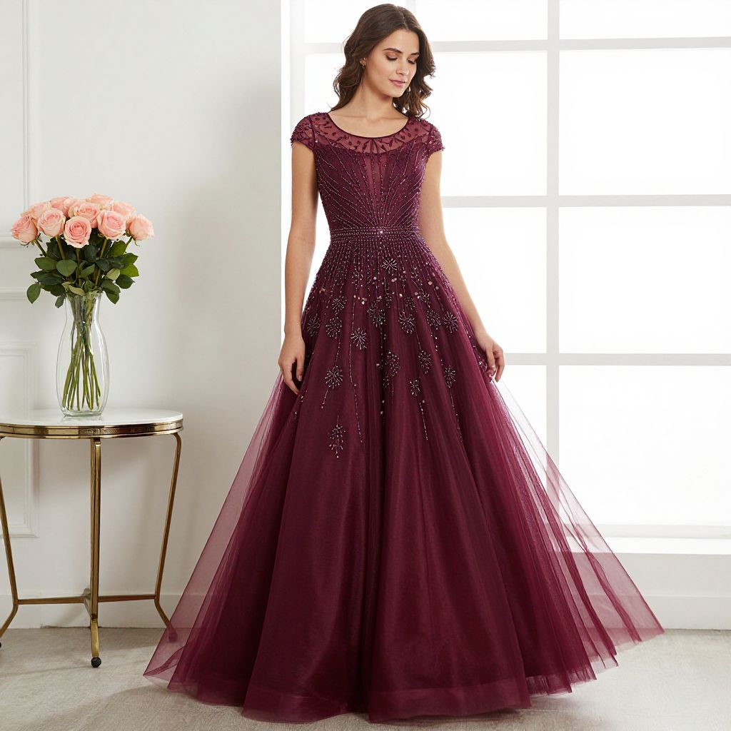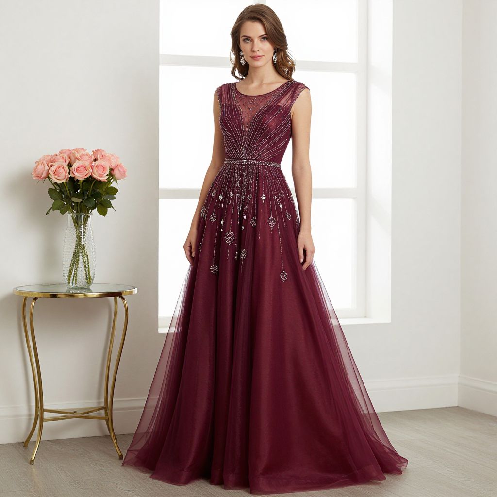 Elegant woman posing gracefully in a burgundy round-neck tulle beads long prom dress, featuring intricate beadwork and a flowing skirt, complemented by a side table with a vase of pink roses casting soft shadows against a bright window backdrop.