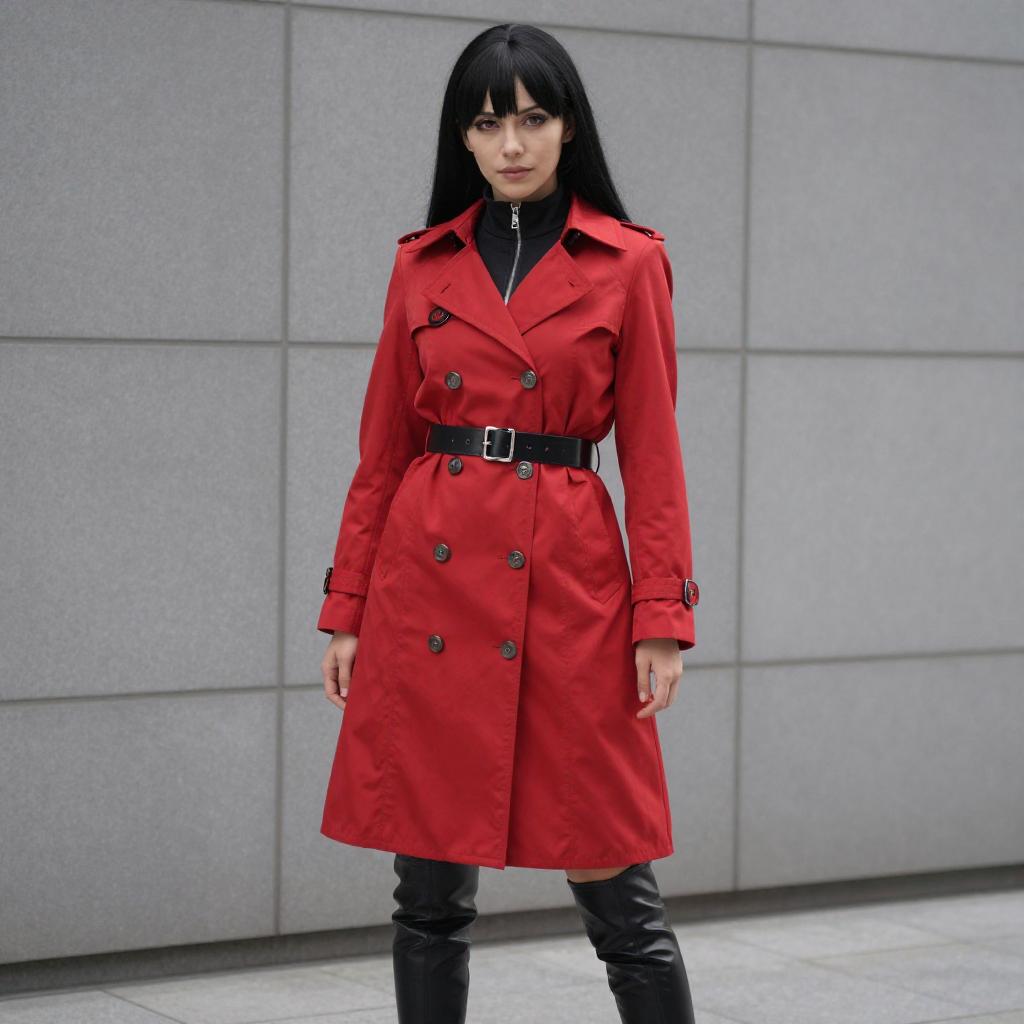 Portrait of a woman wearing a form-fitting red trench coat with silver buttons and a black belt with a silver buckle. She has long black hair with bangs and wears a black undershirt with a zipper and knee-high black boots. The photo is taken outdoors against a gray tiled wall.