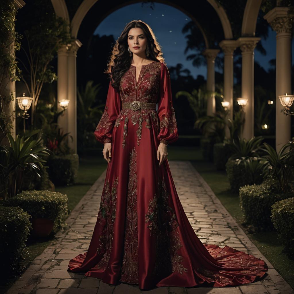 Full body studio portrait of a stunning woman with long dark wavy hair. She is wearing a icy pale blue faille fitted sheath dress with a high side slit and asymmetric neckline. The waist is adorned with a belt of pearls and intricate green beading. dramatic dark background with cinematic spotlighting, high fashion photography, photorealistic, 8k, sharp focus, glamour shot.