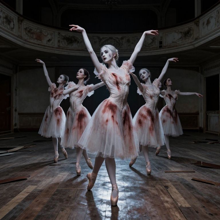 The dreaded ballerinas in an abandoned theater, their graceful yet menacing poses frozen mid-dance, pale skin contrasting with bloodstained costumes, broken wooden floorboards reflecting a ghostly glow, atmospheric and surreal gothic art style.