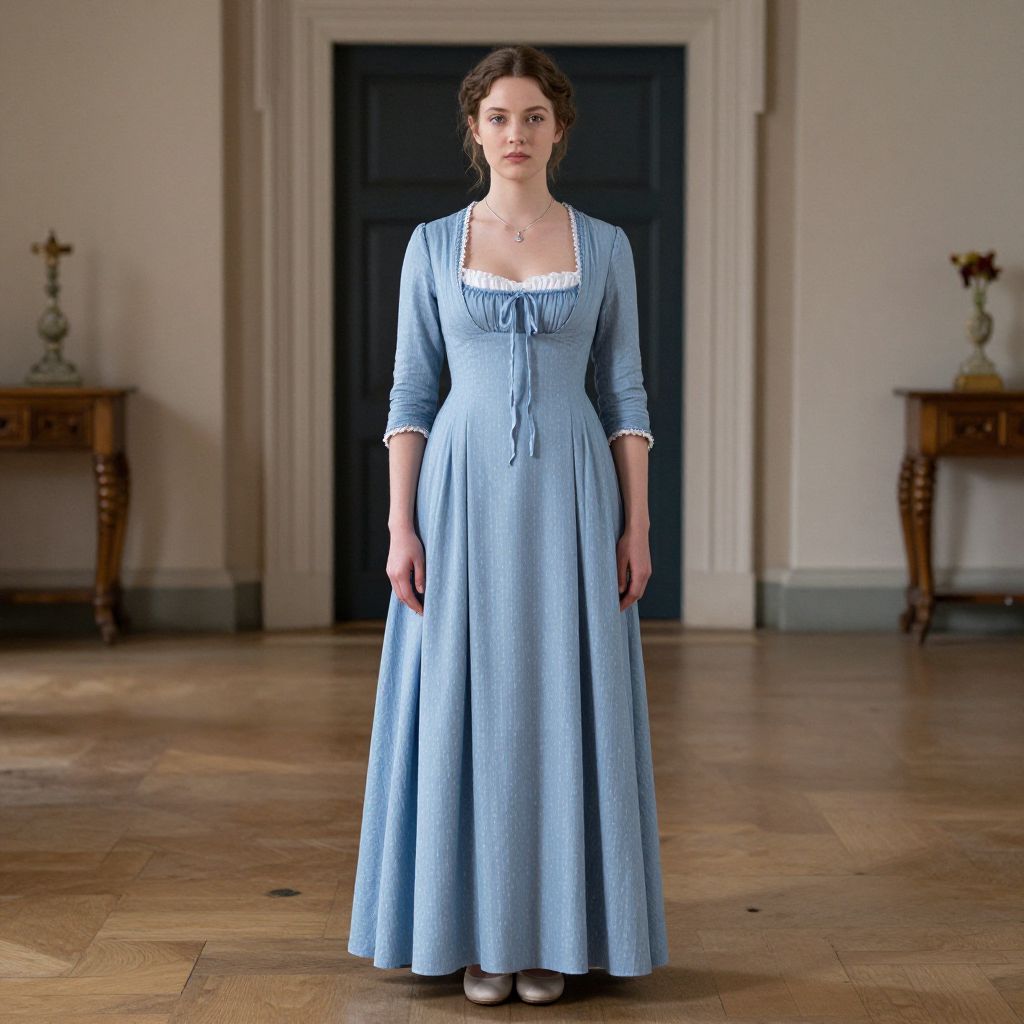 Queen Anne Dress, woman in a blue dress and tiable standing in a hall