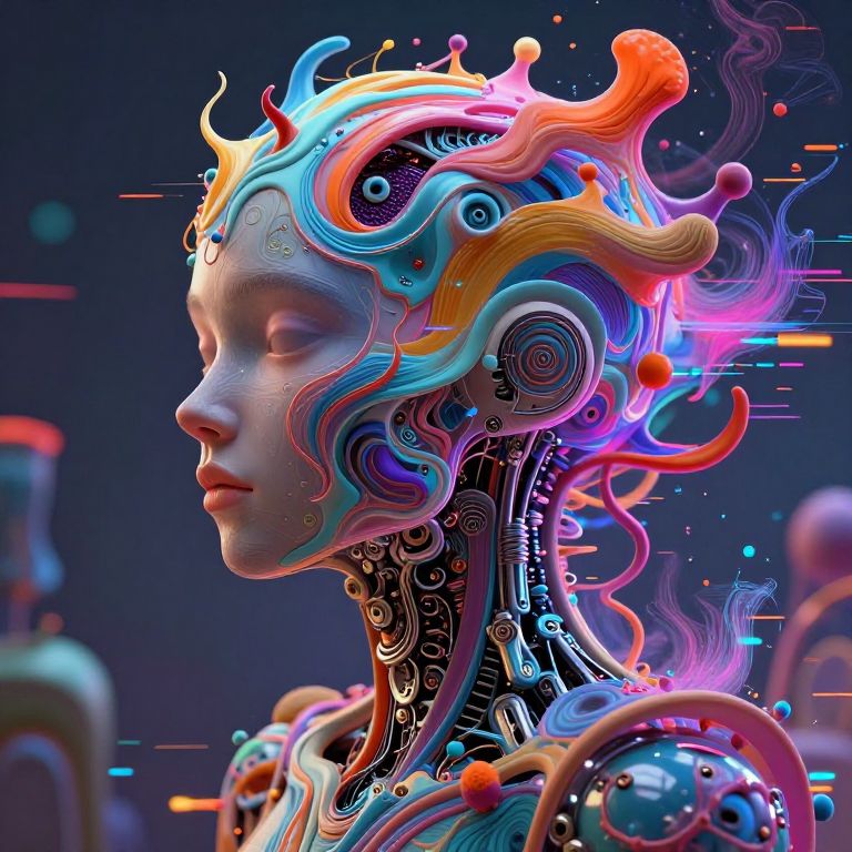 Digital artwork of a futuristic, cybernetic woman with vibrant, neon-colored, swirling headgear and intricate circuitry, against a dark, abstract background