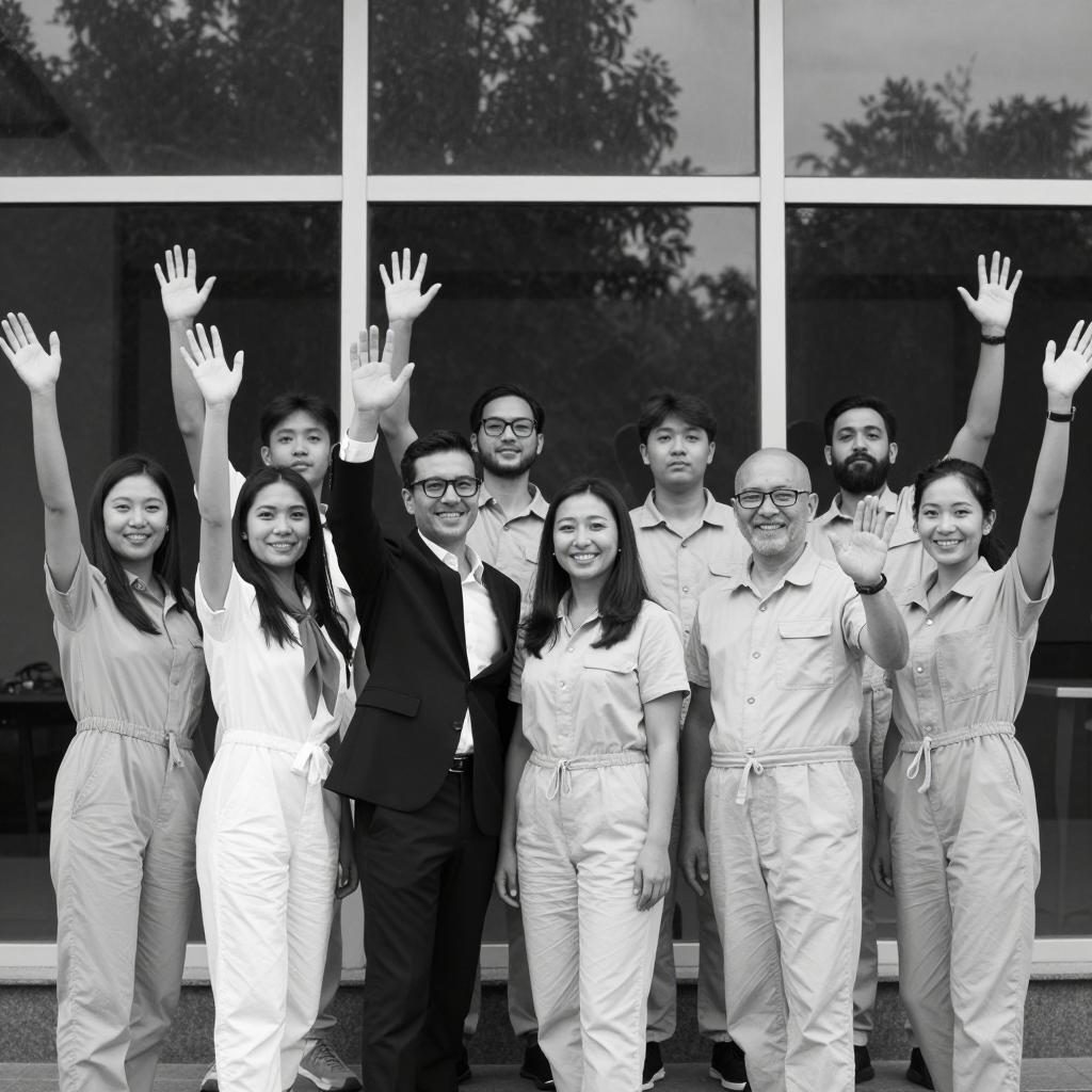 Black and white photograph of 9 people standing in front of a window with arms raised. 2 women and 7 men in light-colored jumpsuits and one man in a dark suit with glasses. 2 women have long hair, one with a scarf. 1 man has a beard. Window reflects trees outside. Smiles on faces. Some men have short hair, one bald. Vertical and horizontal glass panes. Background includes tree reflection and window frame.