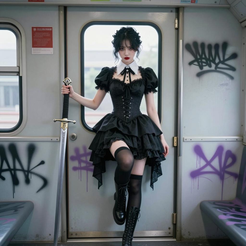 Asian woman with pale skin, black hair in updo, red lipstick, wearing black gothic dress, white collar, corset, black thigh-high socks, and lace-up boots. She holds a sword in her right hand, standing with left leg raised inside a graffiti-covered train car. Background includes train door, purple graffiti, and steps. Her expression is intense. The visual style is realistic photography.
