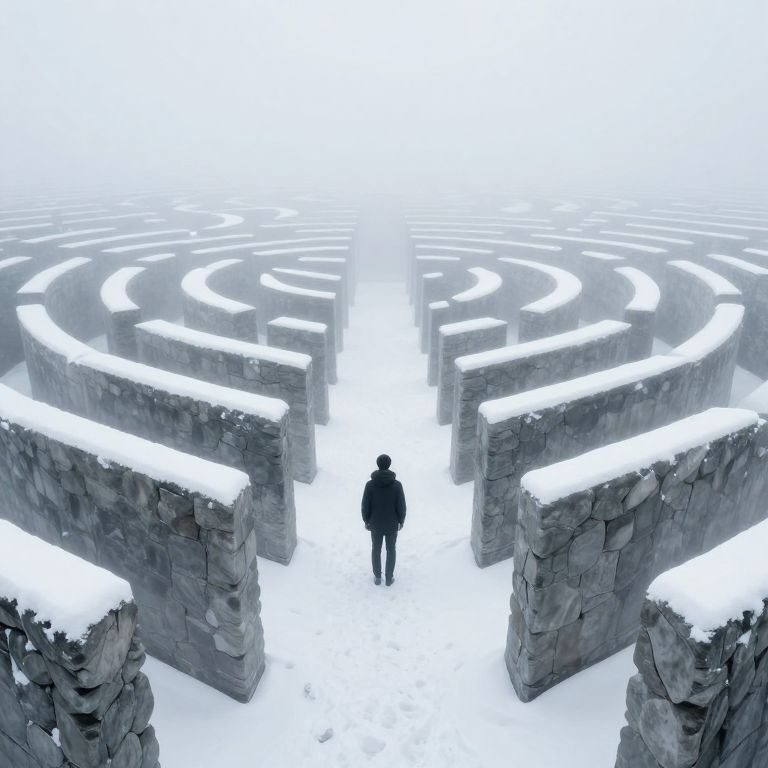 A solitary figure stands at the center of an endless, snow-covered maze of monolithic stone pillars, their edges blurred by a mist that seems to breathe and shift, creating a labyrinth where reality dissolves into an ethereal, ever-changing dream.