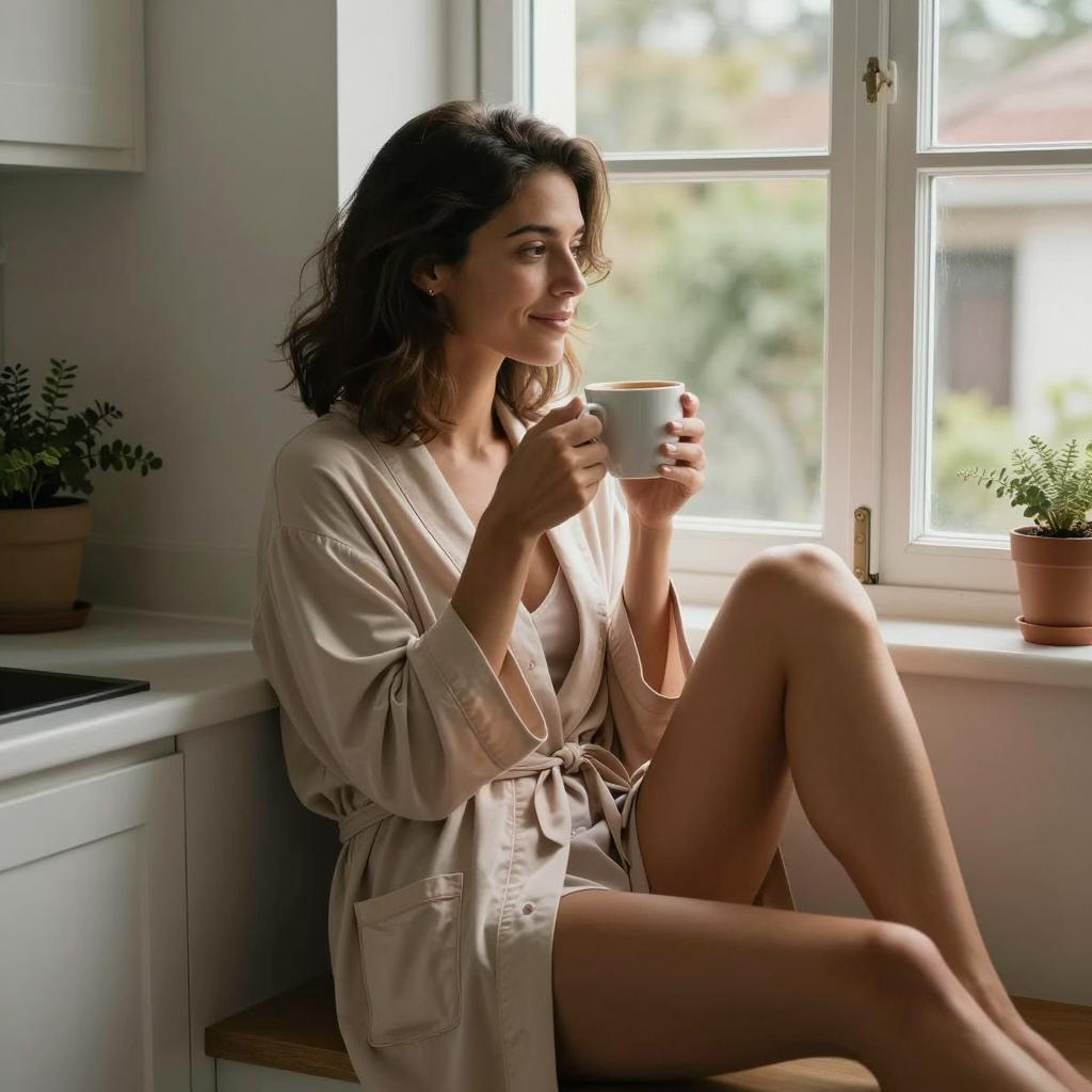 Olive-skinned woman with side-swept dark brown hair, wearing a light beige robe over simple sleepwear, sitting in a small kitchen nook. She holds a white coffee cup at waist level, gazing calmly out the window. The scene is softly lit with warm natural light, featuring potted plants on the windowsill and a relaxed, intimate atmosphere.