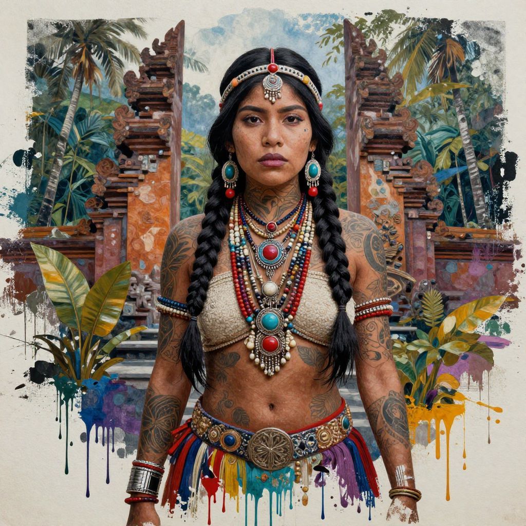 Photograph of an indigenous woman with dark skin and long black hair in braids, adorned with colorful beaded jewelry, including a headpiece, earrings, and multiple necklaces with turquoise and red stones. She wears a beige, beaded crop top and a multicolored, beaded skirt with a decorative belt. Her arms and shoulders are covered in intricate tattoos. She stands in front of a traditional Balinese temple with ornate, red-tiled roofs and lush greenery, including palm trees and banana leaves. The background features vibrant, dripping paint effects, adding a modern, abstract touch to the scene.