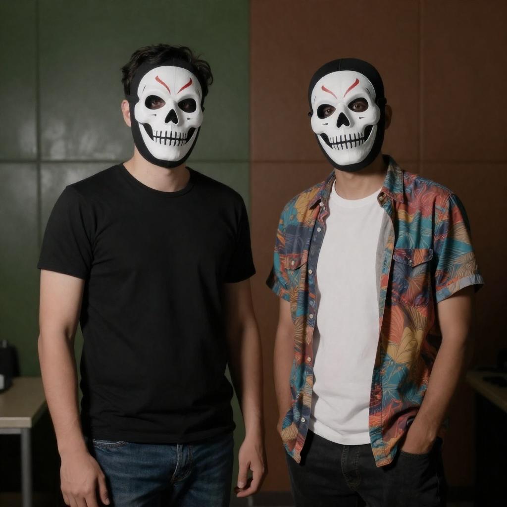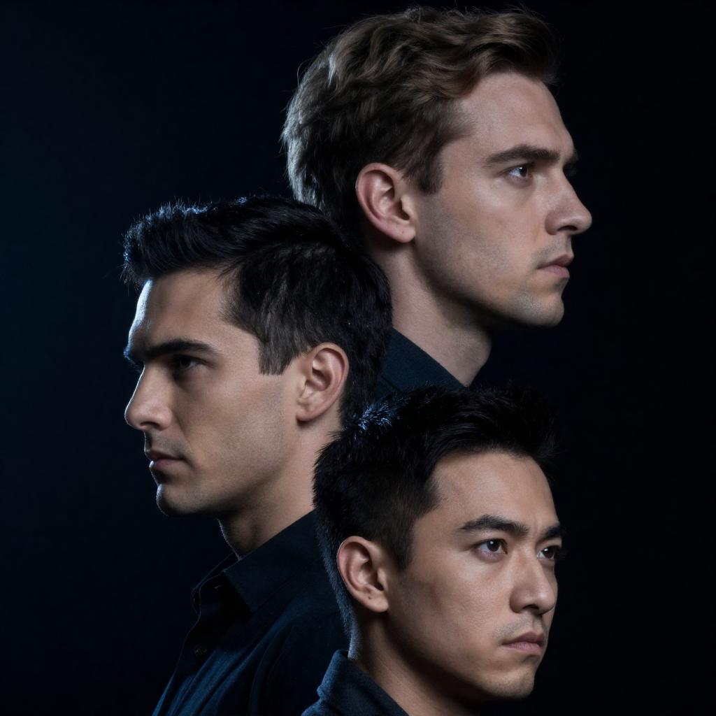 Three men wearing white masks with small eye holes, standing closely together. Each wears a different jacket: black leather, green, blue denim. Masks cover their faces, expressions neutral. Short dark hair, short brown hair, short blonde hair. Indoor setting with neutral-colored background. Masks have smooth ure. Men stand in a row, slightly angled to the right.