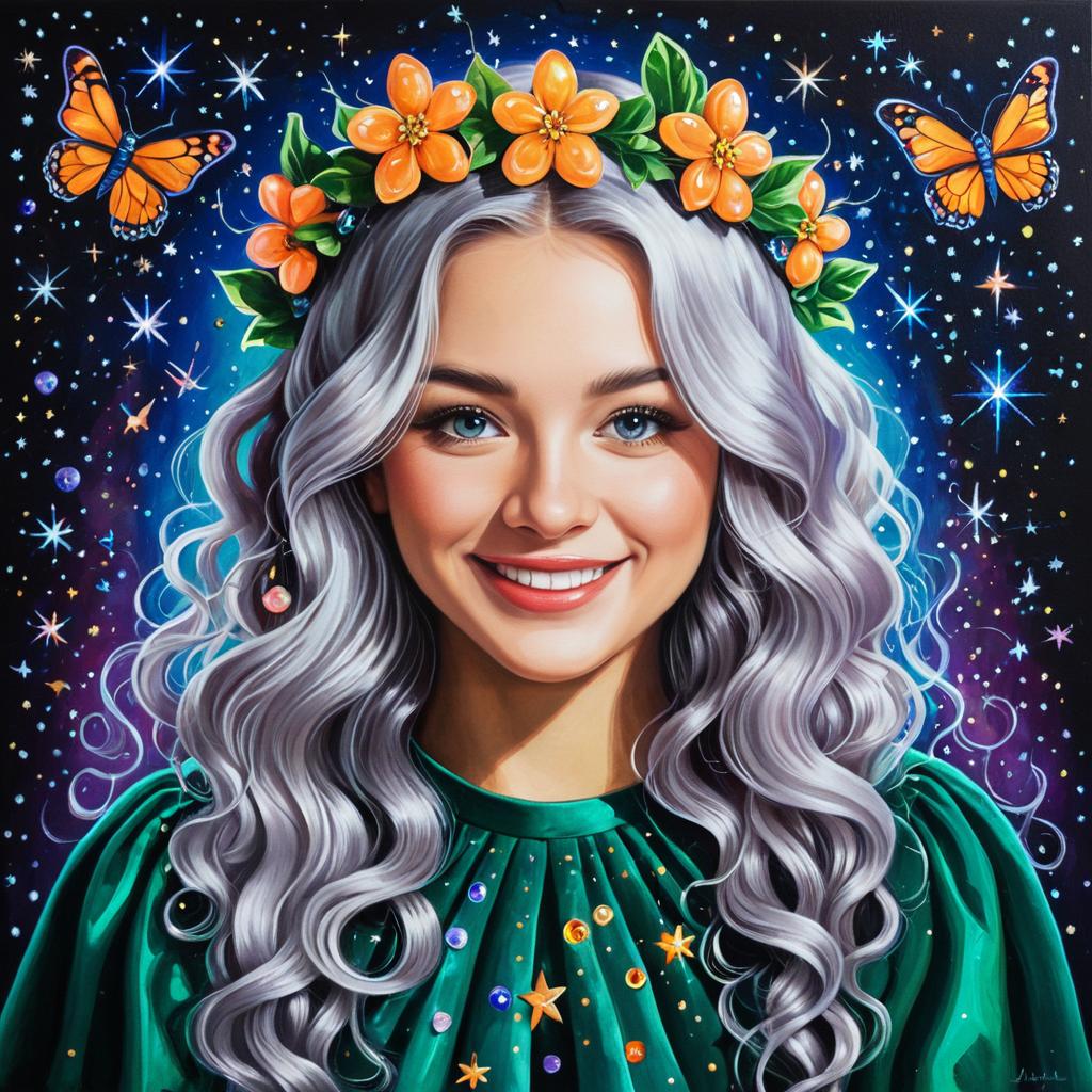 Fine Art This is a portrait of a girl with large amber eyes and thick caramel brown hair. She wears a sky blue dress and a flower crown on her head. She smiles sweetly at the viewer, showing her dimples. Her face is surrounded by colorful butterflies and stars made of perovskite quantum dots. The painting has a soft and dreamy style that creates a fairy-tale atmosphere. The quantum dots can change color and shape when illuminated by a femtosecond laser, adding a holographic effect to the painting. Her hair is styled in a pomelo skin hairstyle that resembles the texture of a pomelo fruit.