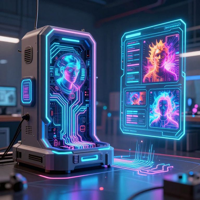 Dalle 3 image generator concept illustrated as a futuristic digital art machine, glowing neon lights, intricate circuits, a holographic interface displaying multiple vivid images in a high-tech studio, cyberpunk style, vibrant colors, hyper-realistic details