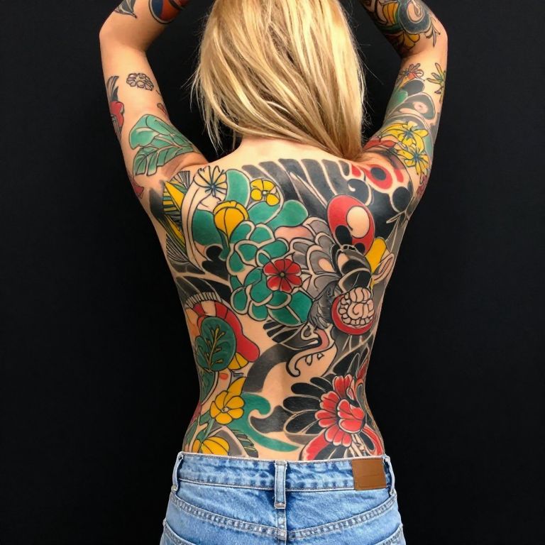 Photograph of a young woman with pale skin and dark dreadlocks, facing left. Her head and neck are heavily tattooed with intricate black and grey floral and geometric patterns. She has a nose stud and dark, dramatic eyeliner. She's wearing a green shirt. The background includes blurred indoor plants and glass windows. The tattoo art is detailed and modern.