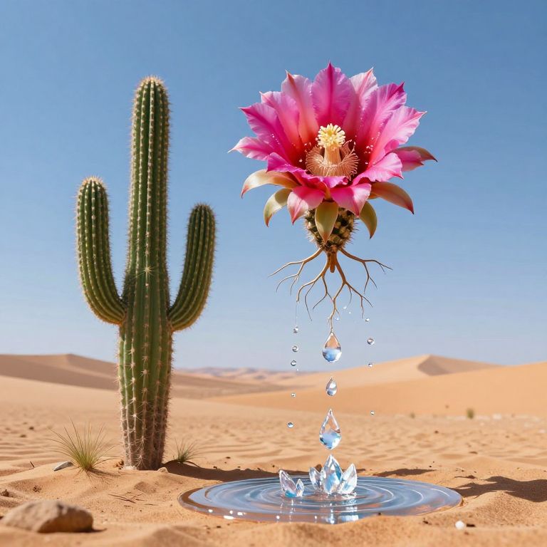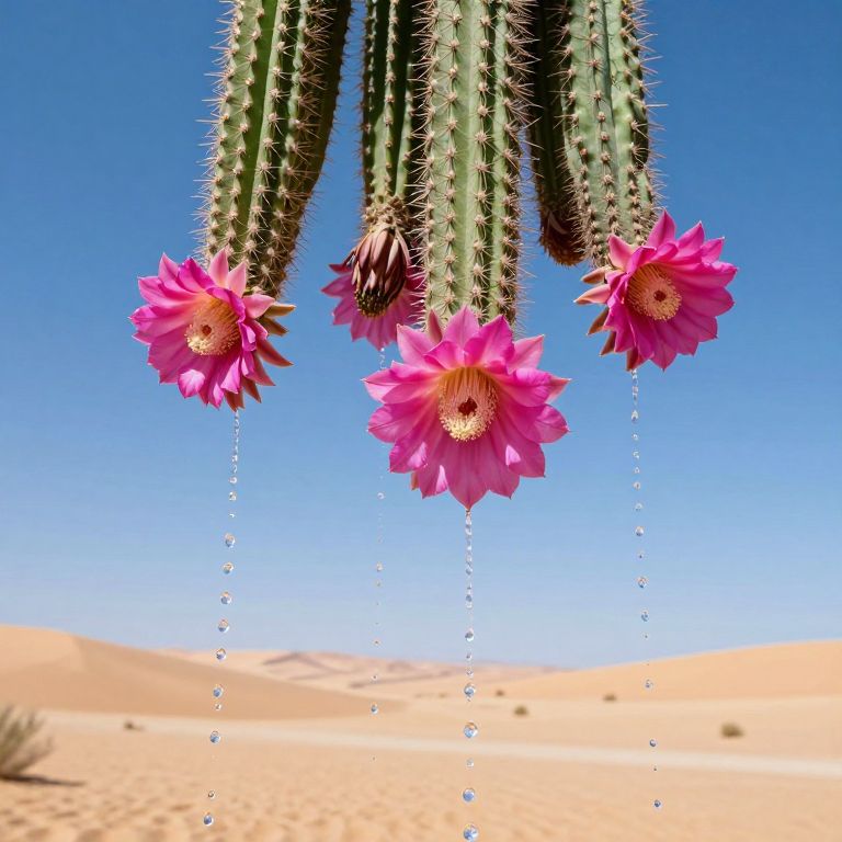 In a surreal desert dreamscape, a vibrant cactus blooms defiantly from the heavens, its roots reaching toward the earth like a celestial offering, while crystalline droplets cascade like tears of hope, transforming the arid sands below into a fleeting oasis of wonder.
