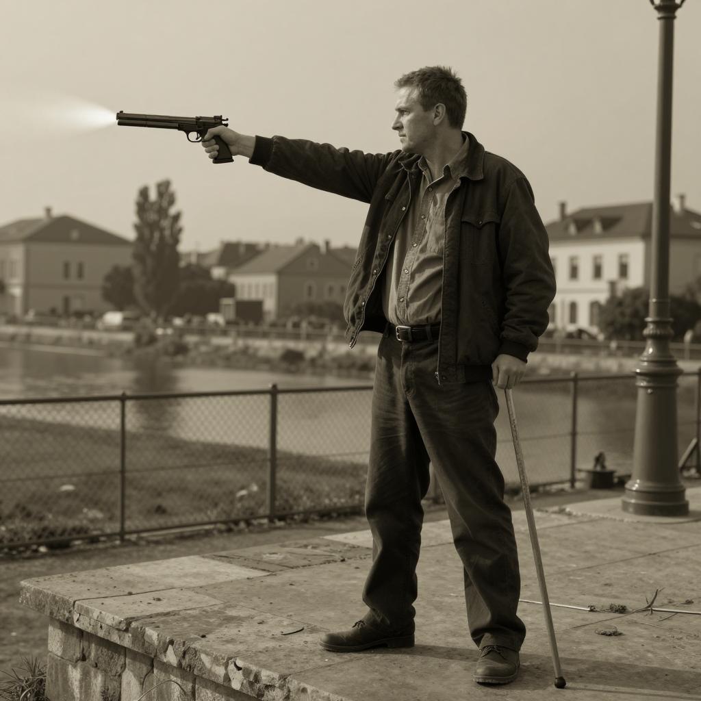 A man with short hair points a gun forward while standing on a stone platform. He wears a dark jacket and pants, with a cane in his left hand. A fenced area and waterway with buildings in the background. The image has a yellow-green color filter. The man's expression is intense. The scene is illuminated by a spotlight.