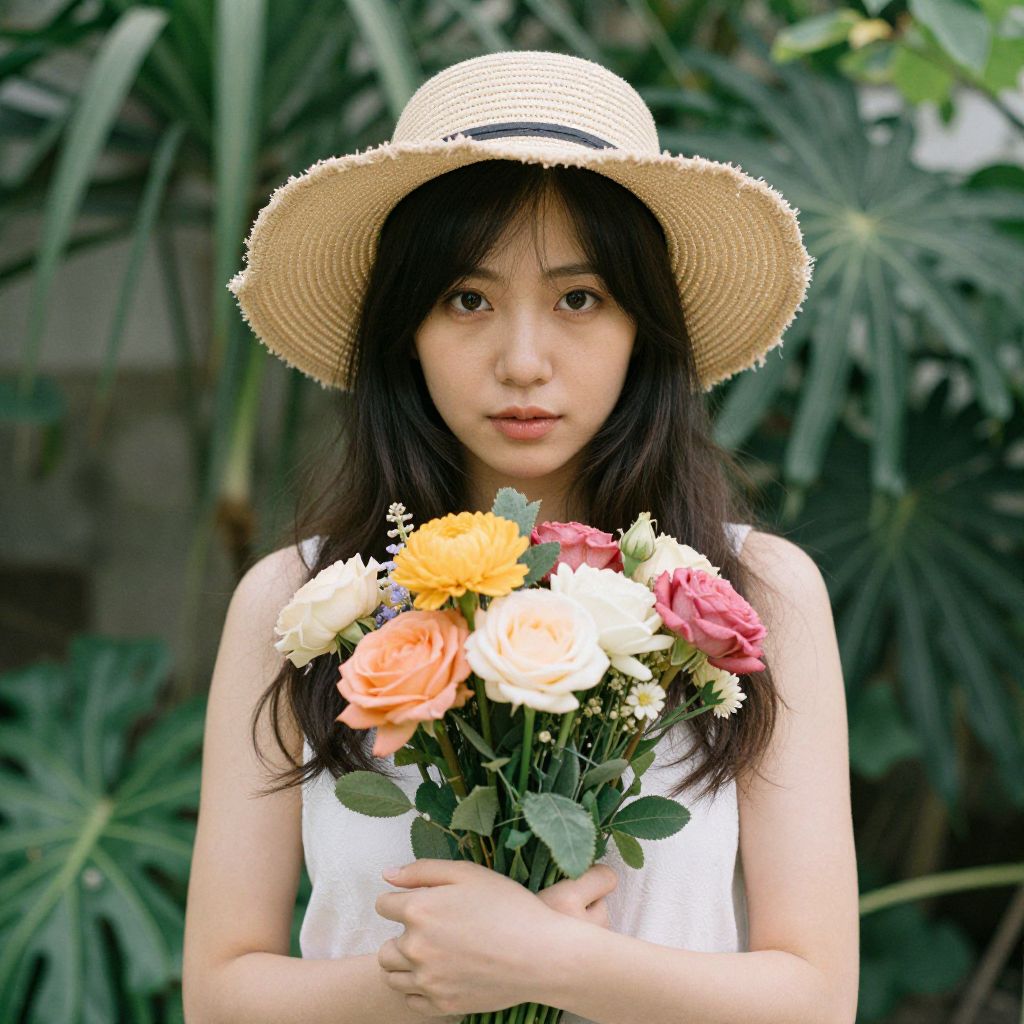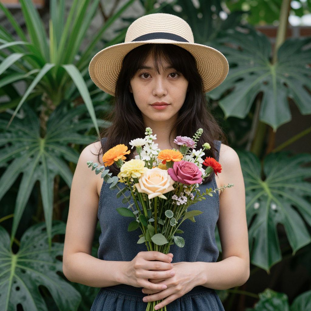 Woman Wearing Hat and Holding Flowers Surrounded by Plants