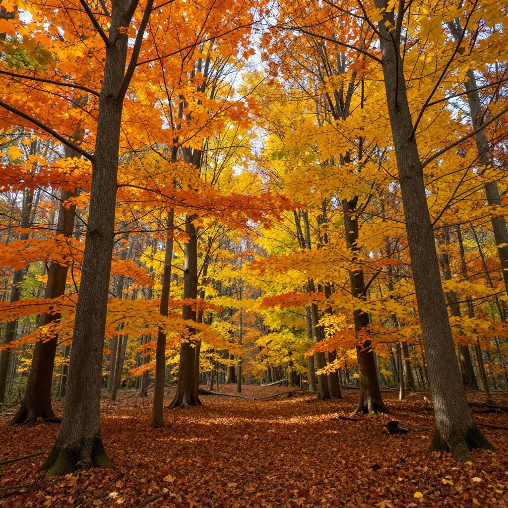 Photograph of a vibrant autumn forest. Tall trees with thick, dark brown trunks stand upright, their branches adorned with bright orange and yellow leaves. The forest floor is carpeted with a thick layer of fallen leaves in shades of orange, yellow, and brown. Sunlight filters through the canopy, creating a warm, golden glow and highlighting the vivid colors. The background shows more trees, slightly blurred, enhancing the depth of the image. The overall scene captures the essence of a crisp, colorful fall day in a dense wooded area.