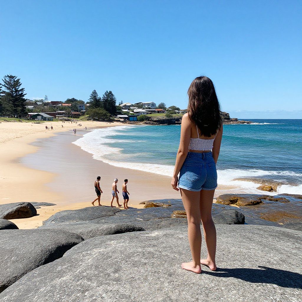 Woman standing barefoot on a rocky outcrop at Manly Beach, Australia, overlooking a vibrant shoreline where three figures walk along the water's edge under a clear blue sky.