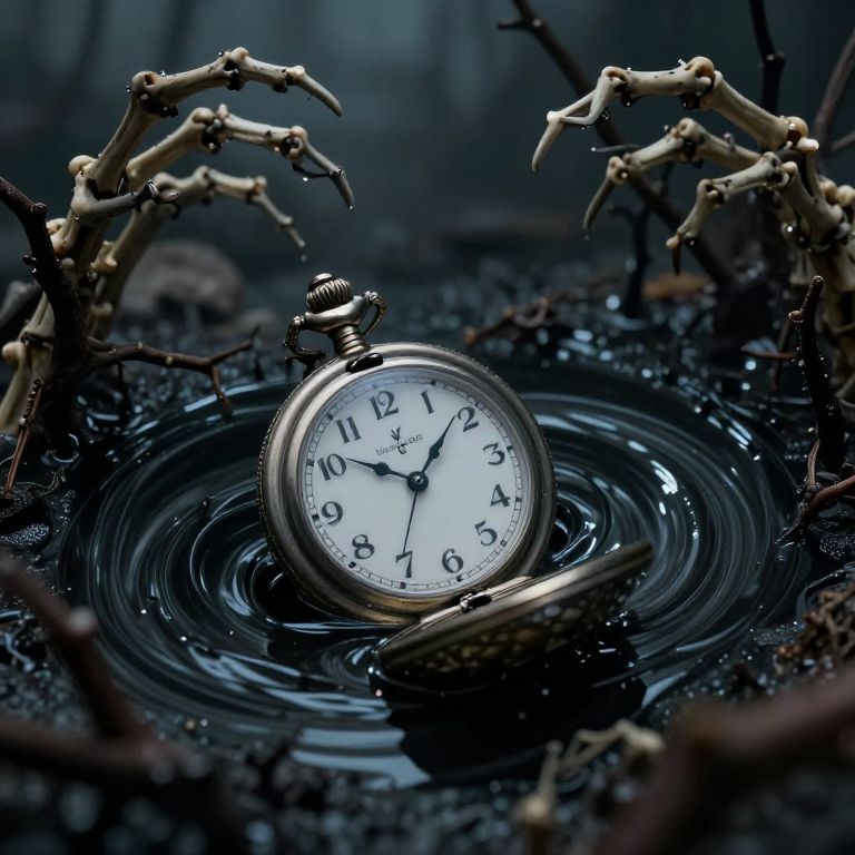 Photograph of a silver pocket watch with a white face and black numerals, partially submerged in a dark, wet, and muddy ground, surrounded by skeletal, claw-like branches. The watch is centered, with ripples spreading outward from the water, creating a dramatic, eerie atmosphere. The background is blurred, emphasizing the watch and branches. The lighting is low, casting shadows and highlighting the reflective surface of the water. The overall mood is mysterious and haunting.