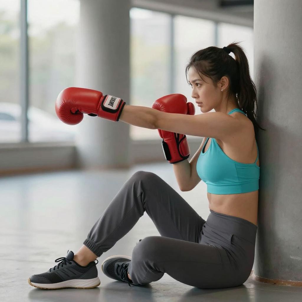 Photograph of a muscular, tan-skinned woman with long brown hair, wearing a white sports bra and black fingerless gloves, standing in a brightly lit boxing ring. Her defined abs and toned arms are highlighted by the light. She has a focused expression, with her arms slightly raised and fists clenched.