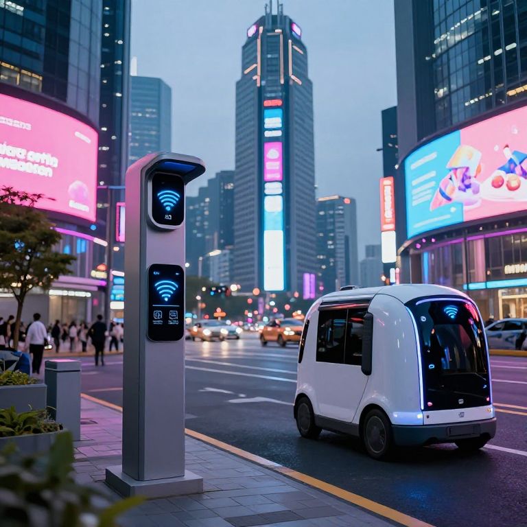 Smart city scene featuring RFID sensors and devices integrated into infrastructure, autonomous vehicles reading RFID signals, urban landscape with advanced technology displays, colorful neon advertisements, sleek modern architecture under dusk lighting, cyberpunk aesthetic