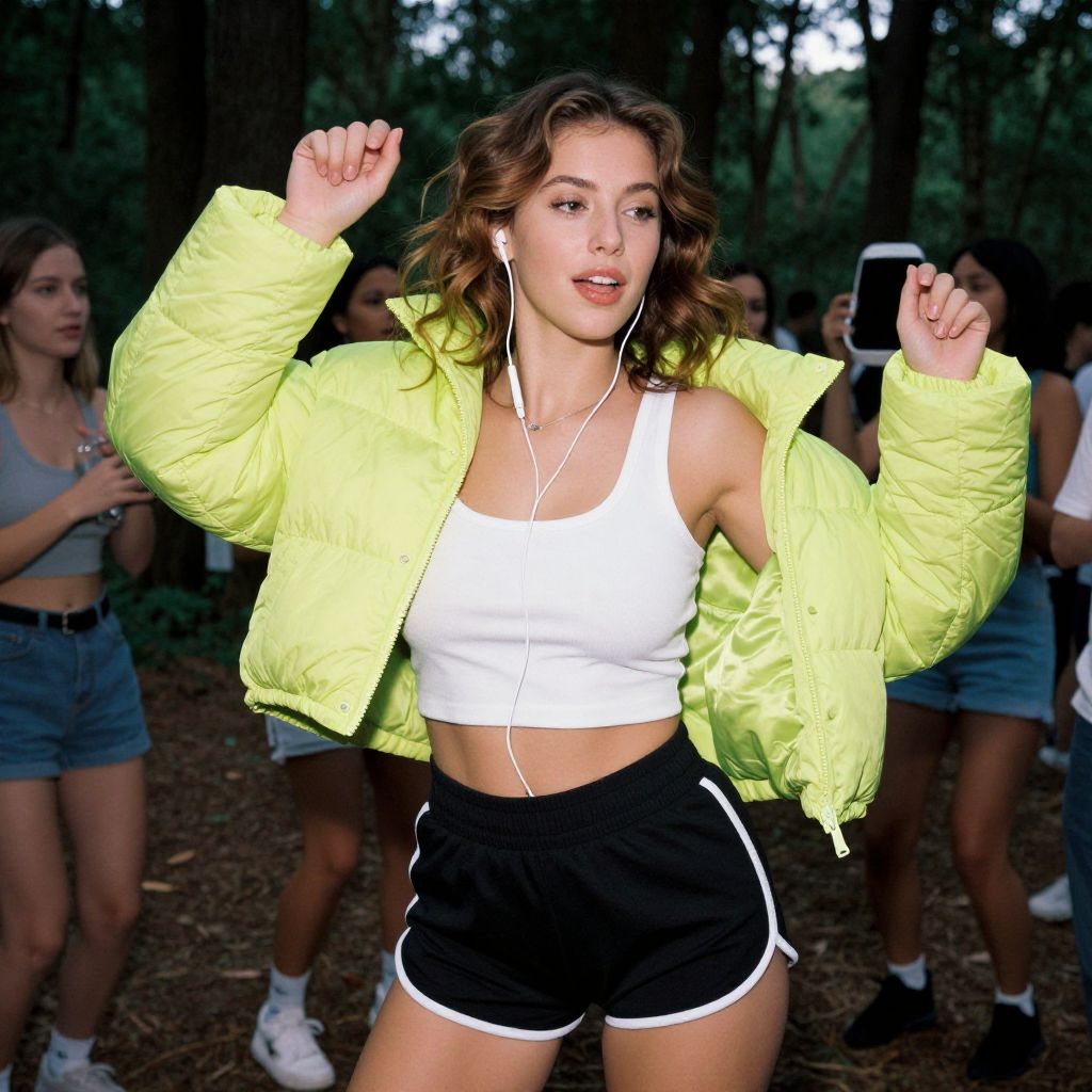 A Hourglass woman, sporty casual, neon green cropped puffer jacket, white crop top, black athletic shorts with white trim, white earphones, natural makeup, wavy hair, in a forest clearing celebration, captured in eastman reversal film stock style, dancing joyfully among friends. Sexy. Pretty face and beаutiful eyes. Big breasts