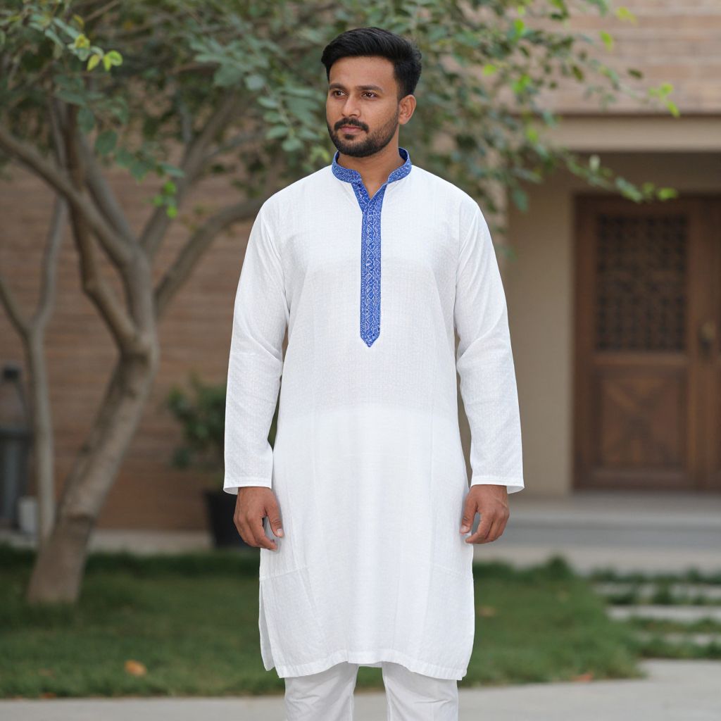 Shalwar Kameez Costume, a man standing in a yard wearing a white and blue kurta