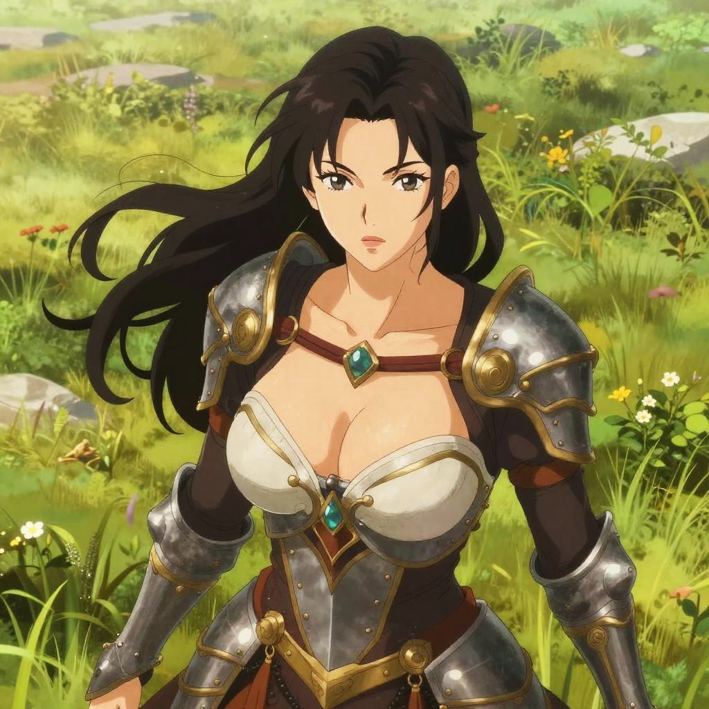 Illustration of a female warrior character with long flowing black hair, wearing ornate silver and gold armor with a revealing design. The woman is set against a vibrant meadow background with lush green grass and scattered wildflowers, creating a natural outdoor atmosphere.