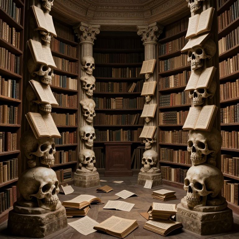 Photograph of a dimly lit, eerie library featuring tall, dark wooden bookshelves filled with old books. Six large, detailed stone skulls are placed on pedestals at intervals between the bookshelves, each holding an open book. The skulls are arranged symmetrically, with some books also scattered on the floor. The room has a classical architectural style with ornate columns and an arched ceiling. The overall color palette includes dark browns, blacks, and the pale beige of the skulls, creating a macabre, gothic atmosphere. The image evokes a sense of mystery and foreboding.