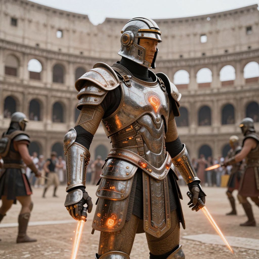 Intricately designed futuristic Roman armor with integrated energy weapons and smart materials, glowing softly in orange hues, set against a backdrop of a high-tech coliseum filled with crowds watching a gladiator battle of the future.