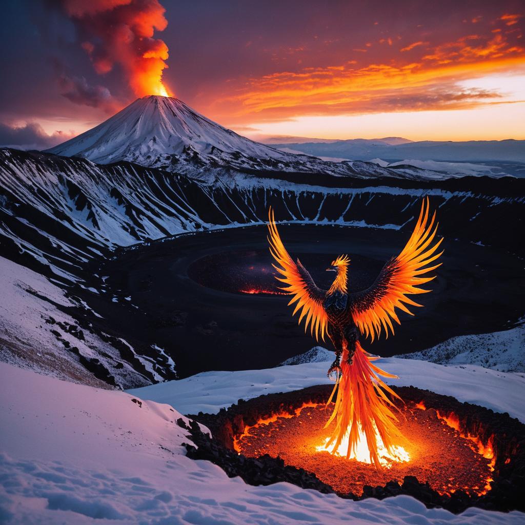 A ethereal phoenix, standing elegantly, gazing at a volcanic crater at twilight, glowing embers light casting warm hues of orange and pink across the sky, glistening snow reflecting light. dramatic vista, highly intricate, capturing intricate robotic features, surrounded by vast wilderness, evoking feelings of wonder and solitude, fiery contrast