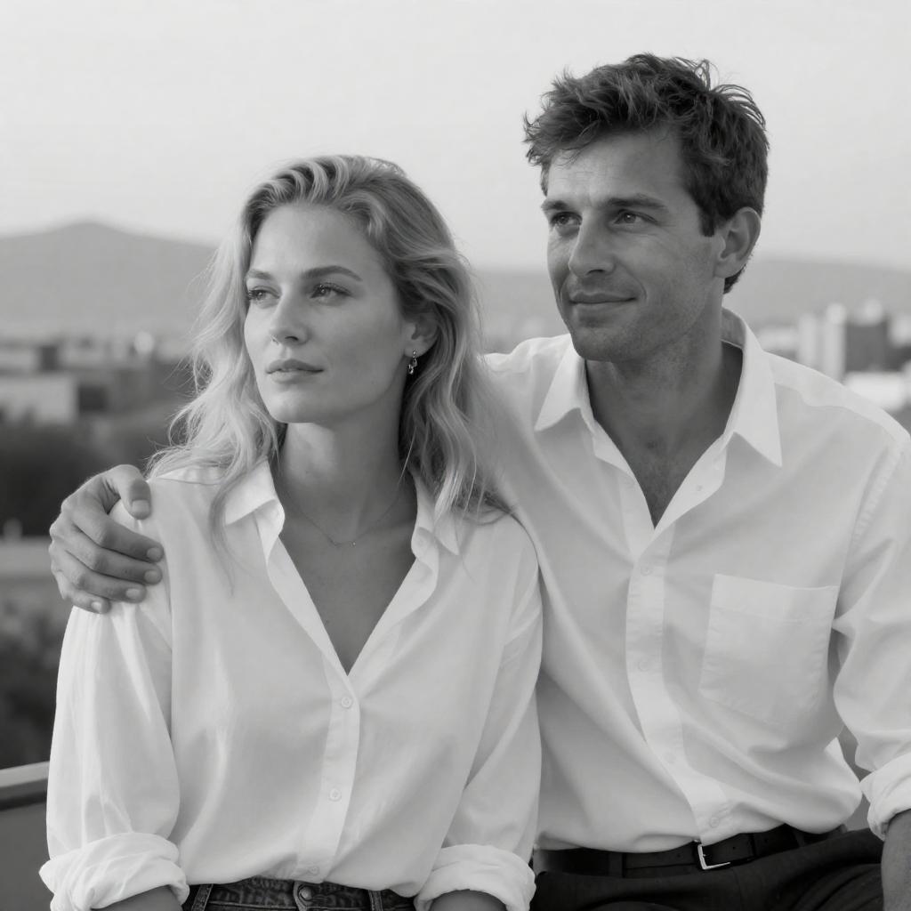 Black-and-white photograph of a man and woman sitting closely outdoors. The woman has blonde hair, wears a white blouse, and gazes to the left. The man has short dark hair, wears a white shirt, and looks forward with a slight smile, his arm resting on the woman's shoulder. A blurred cityscape and mountains appear in the background.