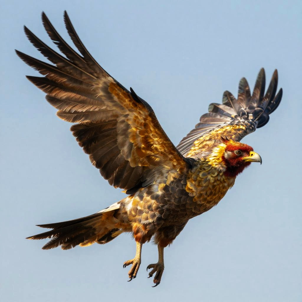 Swoopy feathers on a majestic mythical bird in mid-flight, illuminated by golden sunlight, detailed texture and graceful motion, rich warm colors against a clear blue sky, fantasy art style