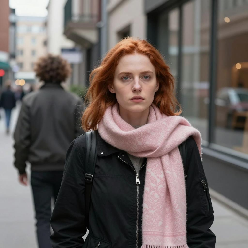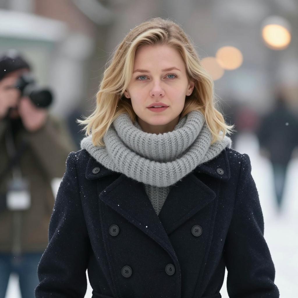 Woman with shoulder-length blonde hair, wearing a dark ured coat and light gray knitted scarf, stands outdoors in the snow. Background is blurred with warm, bokeh lights. Snowflakes visible. Neutral facial expression. Photographer's hand on the left. One person.