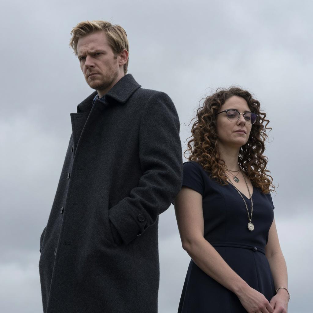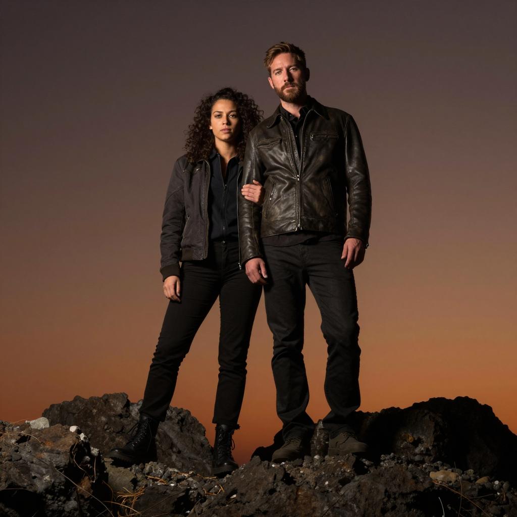 Photograph of a man and woman standing on rocky terrain under a dark orange gradient sky at sunset. The man has short brown hair, a beard, and wears a dark leather jacket and black pants. The woman has curly dark hair and wears a dark jacket and black pants, slightly leaning into the man. Both exhibit neutral expressions with the man's left arm around the woman's waist, set against large dark rocks in the foreground.