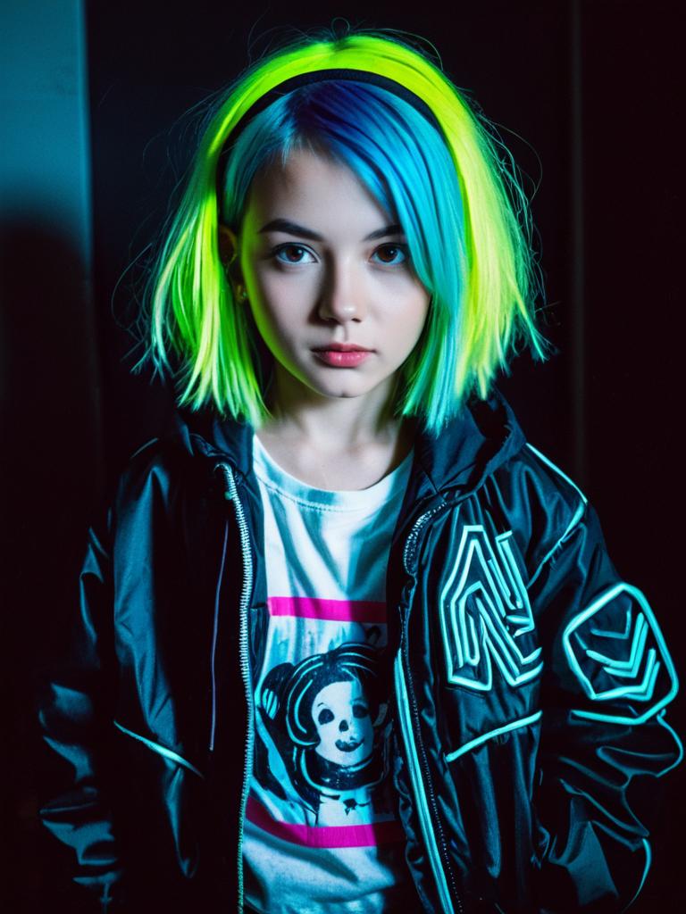 Neon Artist Costume Child, image of a girl with a neon hair and a jacket
