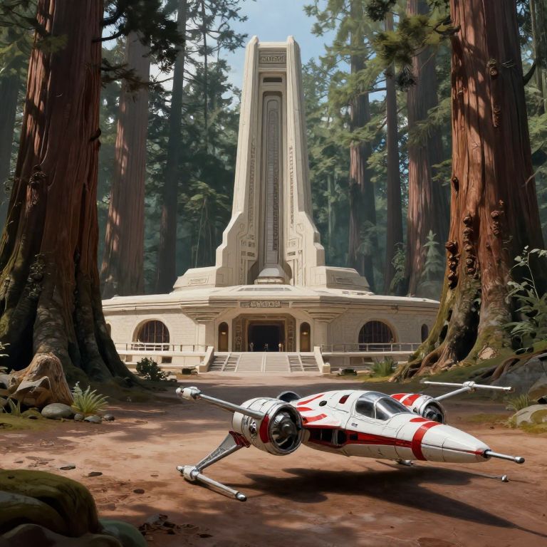 Eraser matte painting of a jedi temple in the giant sequoia forest Star Wars with an x wing in the foreground,