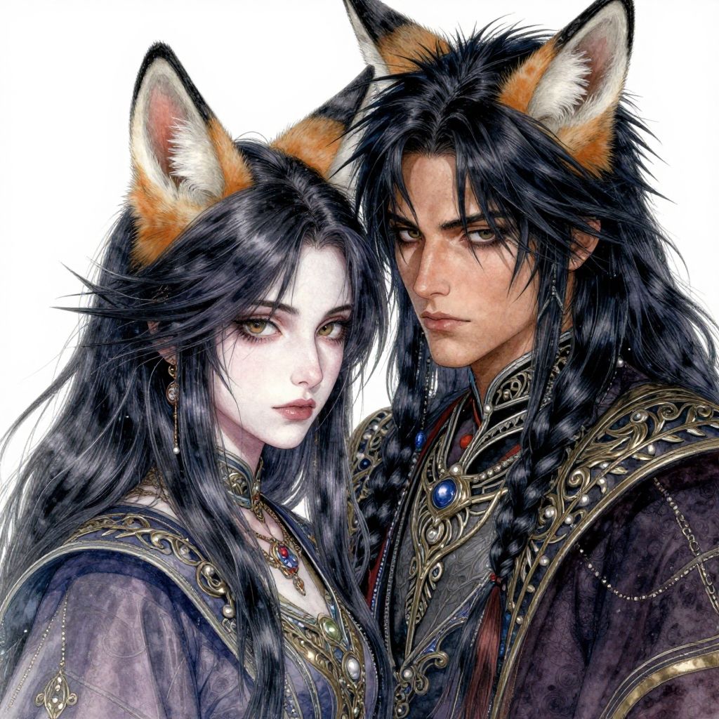 Art by Ellen Jewett, Dan Mumford, Kajenna, Victoria Francis, Close-up portrait of a 20-year-old girl and a 25-year-old man Mysterious woman exhibiting symmetry, possessing snowy complexion, adorned with long, spiky raven locks, and fluffy fox ears, garbed in intricate attire, nestled in the realm of fantasy art, a full-color manga masterpiece or advanced digital game cover art, breath of cryptic aura, ultra-detailed texture, amidst transparent background, fit for art gallery, poised in high resolution at 8k, effortless perfection, microscopic detail, genuine surface reflections, volumetric lighting, cinematic effects, Watercolor, trending on artstation, sharp focus, studio photo, intricate details, highly detailed, by greg rutkowski